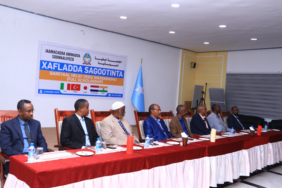 Muqdisho, Aug 31, 2022: Jaamacadda Ummadda ayaa xalay kulan casho sagootin iyo dardaaran ah u samaysay 29 arday oo deeq waxbarasho u aadaya wadamada Talyaaniga, Türkiye, netherlands Japan iyo India. Munaasabada waxaa ka qaybgalay Wasiirka Wasaaradda Waxbarashada, Hiddaha Iyo Tacliinta Sare ee XFS mudane, Faarax Sheekh Cabdulqaadir, Raktarka Jaamacadda Ummadda Soomaaliyeed (JUS) Dr. Xasan Cumar Mahadalla, Raktar xigeenka Arrimaha Waxbarashada Prof. Aadan Guuleed Shabeel, qaar ka mid ah Hormuudyada, Asgaasimayaasha maamulka, macalimiin iyo martisharaf kale.