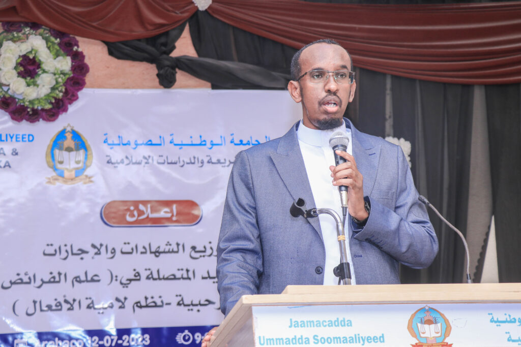 Sidoo kale Dr. Maxamed Iimaan (Shaadibi) ayaa munaasabada ka jeediyay dardaaran dhaxal gal ah. waxaa kale Xafladda ka hadlay guddoomiyaha Naadiga ardayda JUS Faarax Nuur Salaad iyo gudoomiyaha Midowga ardayda Kulliyadda Shareecada C/xakiim Xassan Afrax.