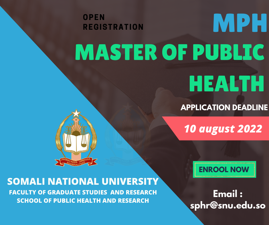 The Faculty of Postgraduate and Research at Somali National University is now accepting new students for Master of Public Health Program.