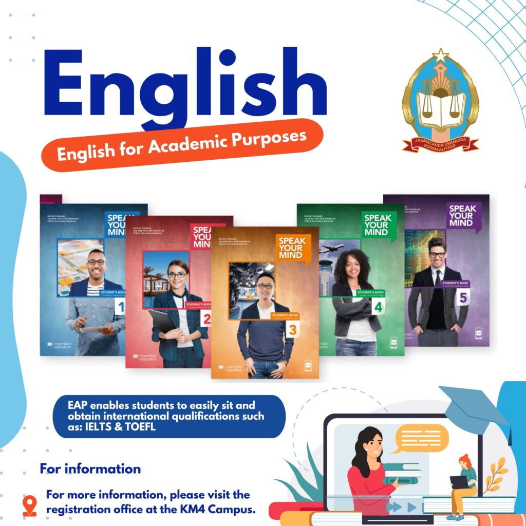 Somali National University has introduced an English for Academic Purposes (EAP) which consists of 5 levels, in order to improve the learning capacity by improving their language efficiency of the English language.