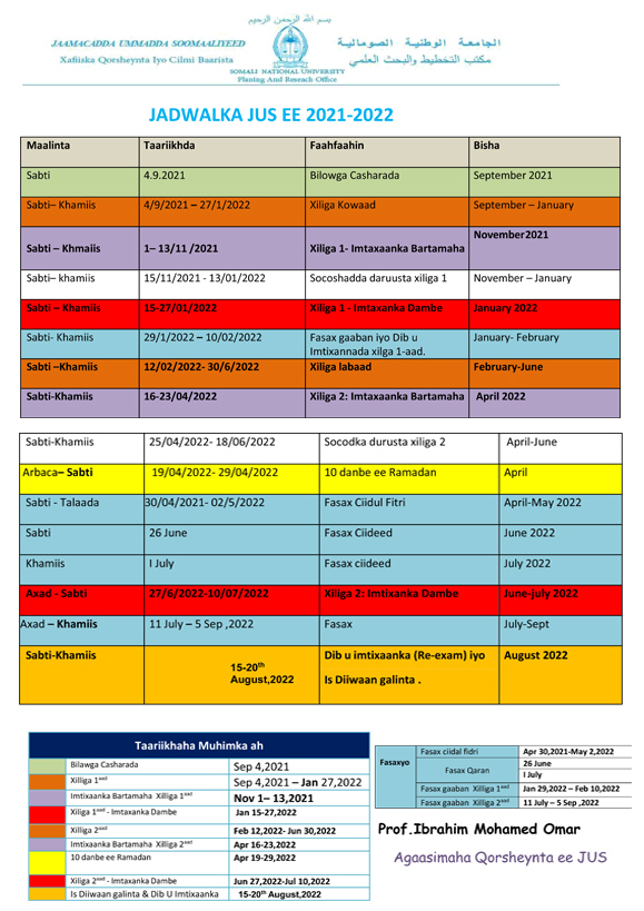 Kalandarka waxbarashada Sannad-waxbarasheedka Jaamacadda 2021-2022