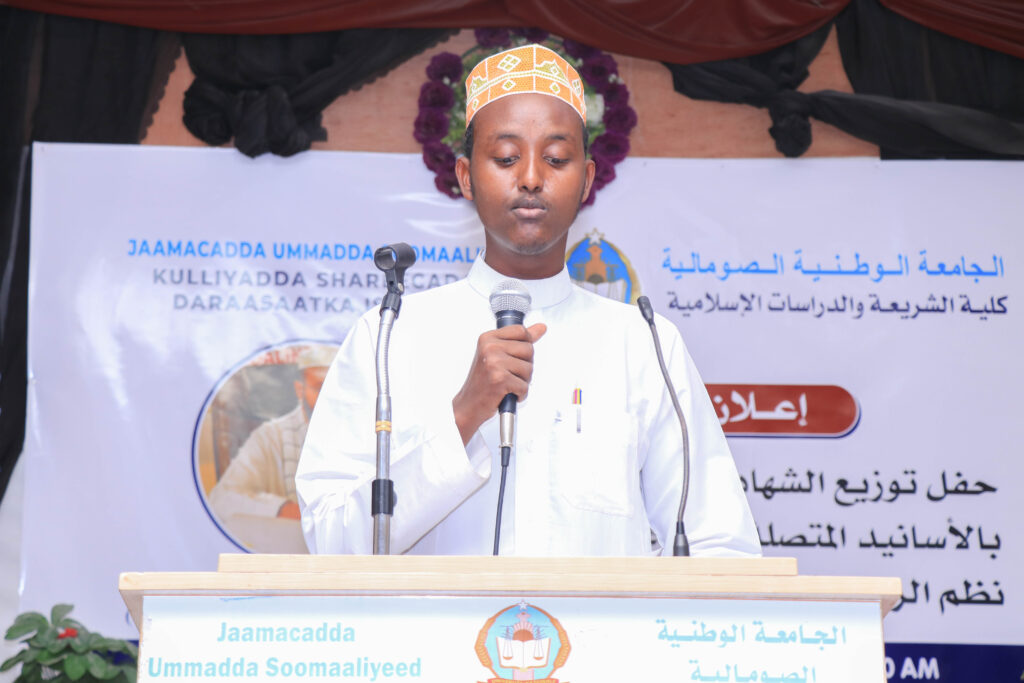 Sidoo kale Dr. Maxamed Iimaan (Shaadibi) ayaa munaasabada ka jeediyay dardaaran dhaxal gal ah. waxaa kale Xafladda ka hadlay guddoomiyaha Naadiga ardayda JUS Faarax Nuur Salaad iyo gudoomiyaha Midowga ardayda Kulliyadda Shareecada C/xakiim Xassan Afrax.